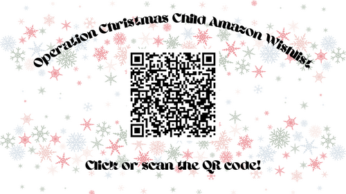 During the month of October, we are supporting Operation Christmas Child by packing showboxes full of toys and other goodies for children in need across the world to share the joy of Jesus. If you are interested in helping, we have a youth wish list via the QR code below. Scan or click on it to be taken directly to the website. . If you are interested in helping pack the shoeboxes, the youth will be traveling to the OCC center to help. Contact our Youth Director, Danyel, with any questions.
